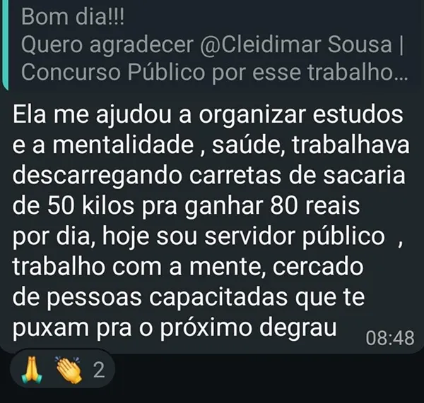 Eu sou Cleidimar Sousa, servidora pública federal nomeada 5 vezes em concursos como INSS, MPU, TRE, IFB e Conselho Nacional de Radiologia.